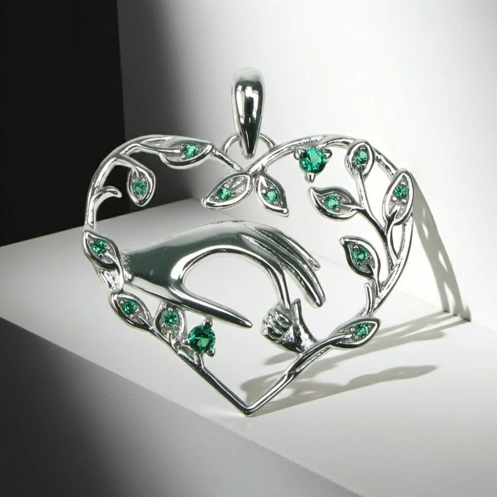 Sterling Silver Caring Hands Heart Pendant with Emerald CZ [Sale]
