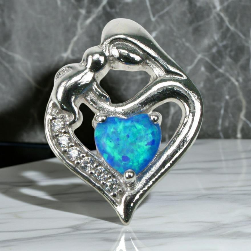 The heart is inlaid with clear cubic zirconias and has a central shimmering Blue Opal heart-shaped claw-set stone.