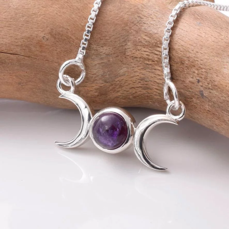 Beautiful 925 sterling silver necklace of the Triple Moon with a central Amethyst cabochongemstone representing the dark New Moon on an integral box chain.