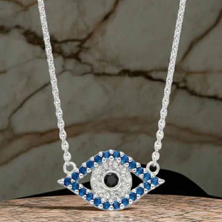 925 sterling silver Evil Eye set with sapphire blue and clear Cubic Zirconias and a central black crystal on an integral fine curb chain.
