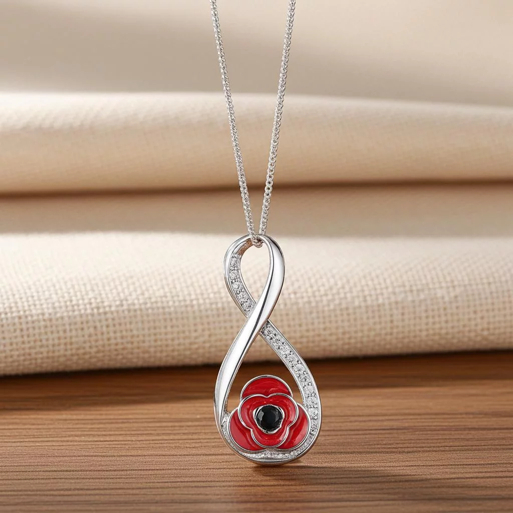 Beautiful and meaningful 925 sterling silver, cubic zirconia and red enamel Poppy Infinity knot pendant.