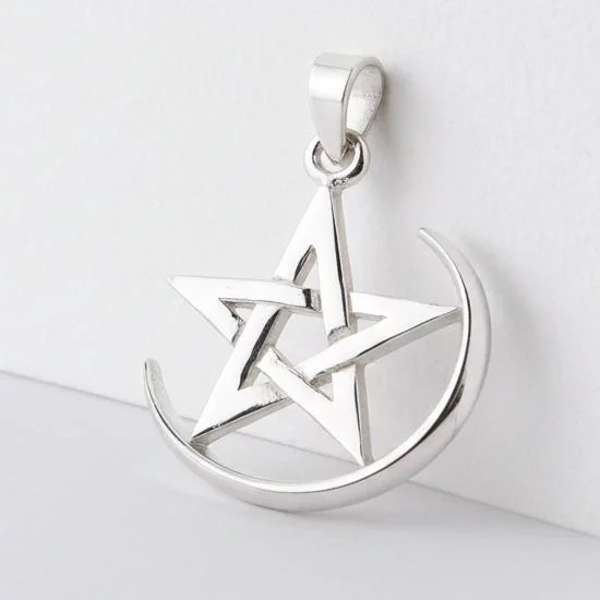 • Beautifully crafted 925 sterling silver pendant featuring an interwoven pentagram resting on the 'maiden' waxing crescent moon.