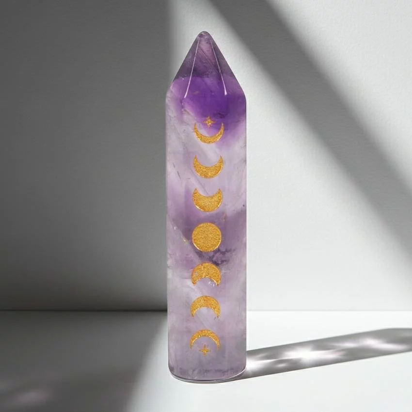 Our hand crafted Amethyst Moon Phases Crystal Point featuring a gold-tone moon phase engraving is a lovely crystal to use to work with Moon energy and to connect to the Moon.