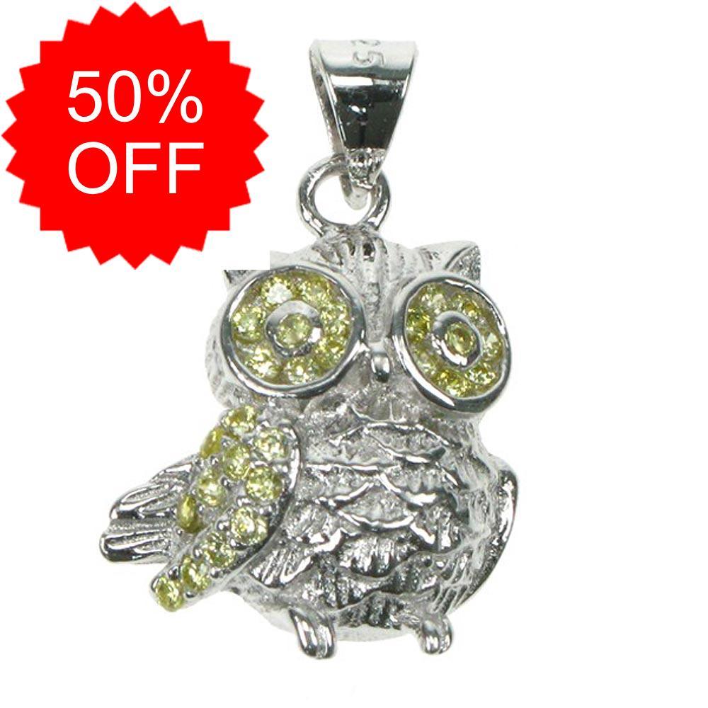 Charming 925 sterling silver Owl pendant set with sparkling lemon yellow Cubic Zirconias on the eyes and wing. The reverse is hollow.