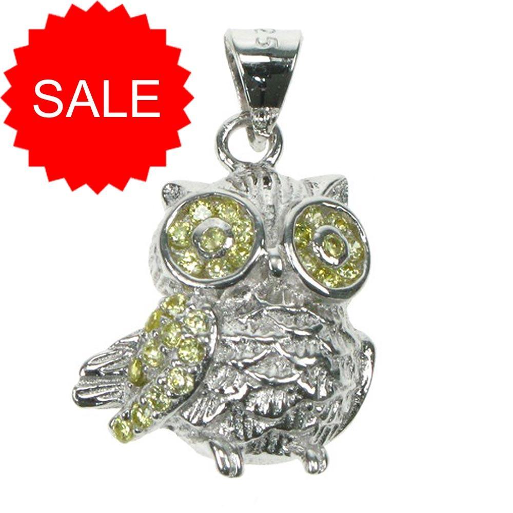 Charming 925 sterling silver Owl pendant set with sparkling lemon yellow Cubic Zirconias on the eyes and wing. The reverse is hollow.