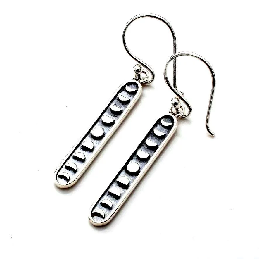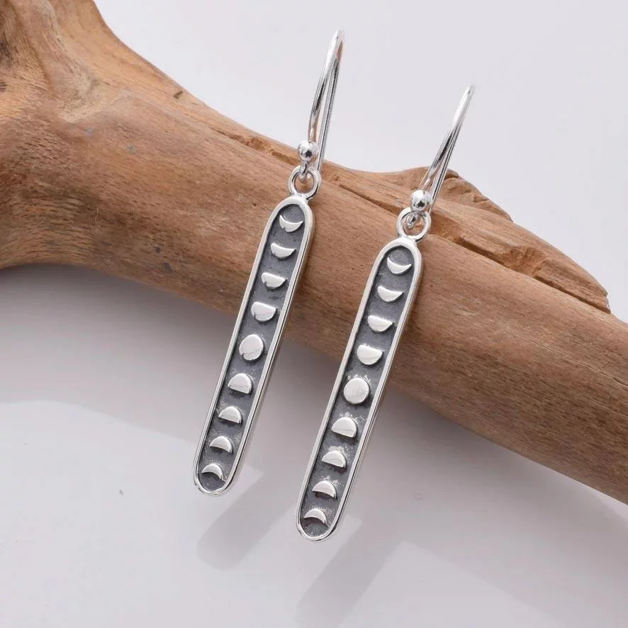 Lovely 925 sterling silver Moon Phases long drop earrings with oxodised finish.