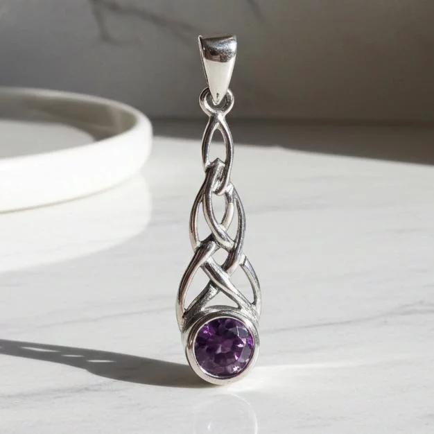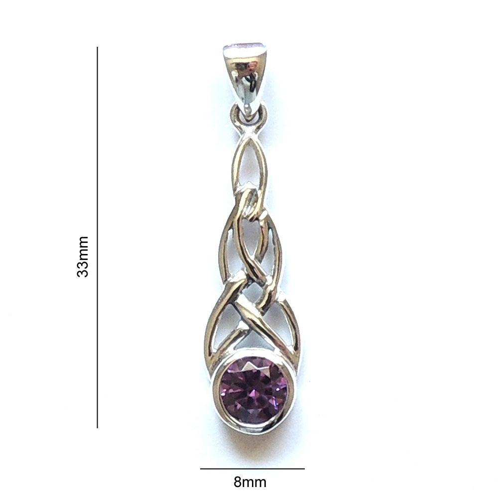 Elegant 925 sterling silver Celtic Knot pendant set with a faceted Amethyst Cubic Zirconia.
