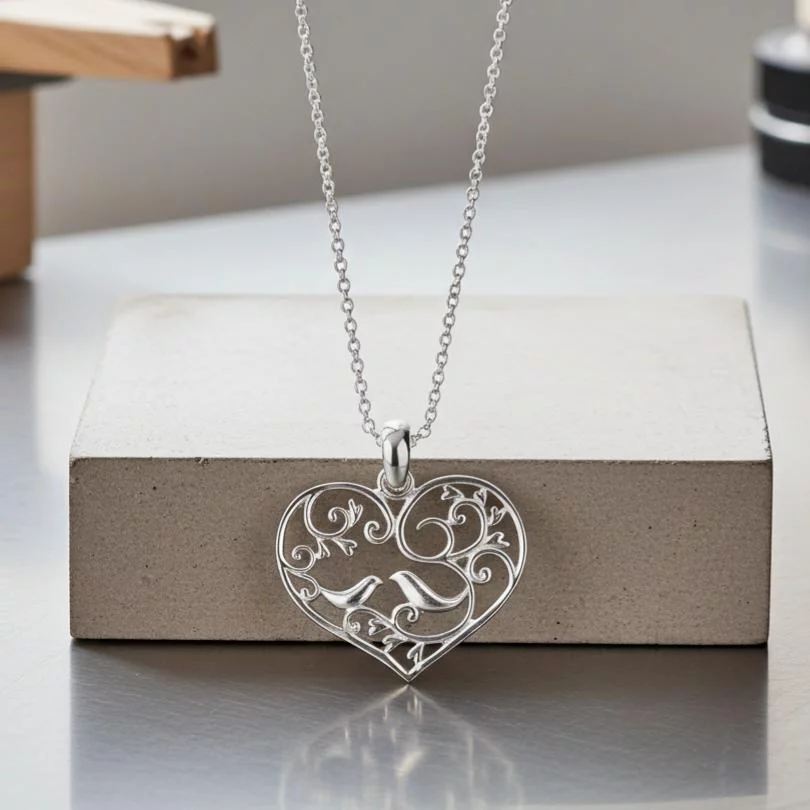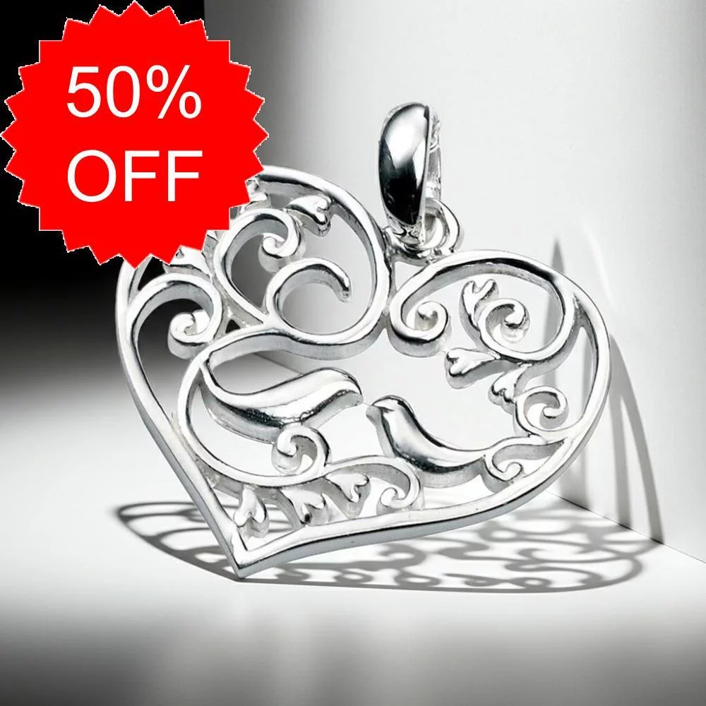 925 sterling silver pendant featuring a pair of lovebirds nestled within a filigree heart.