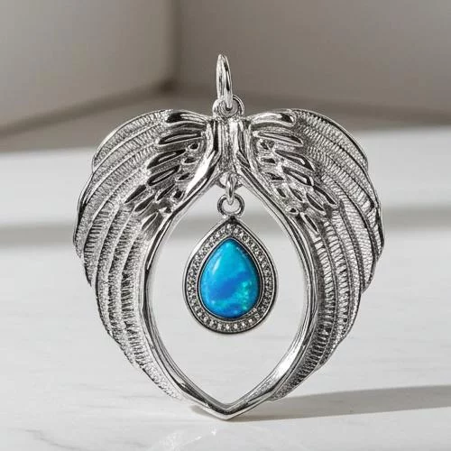 • Large 925 sterling silver pendant featuring a shimmering Blue Opal pear-shaped stone hanging within a pair of gently curved Angel wings.