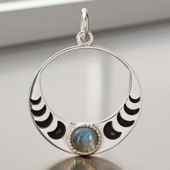 Stunning 925 sterling silver pendant featuring a lower crescent moon set with a central cabochon Labradorite gemstone which is flanked by engraved phases of the moon.