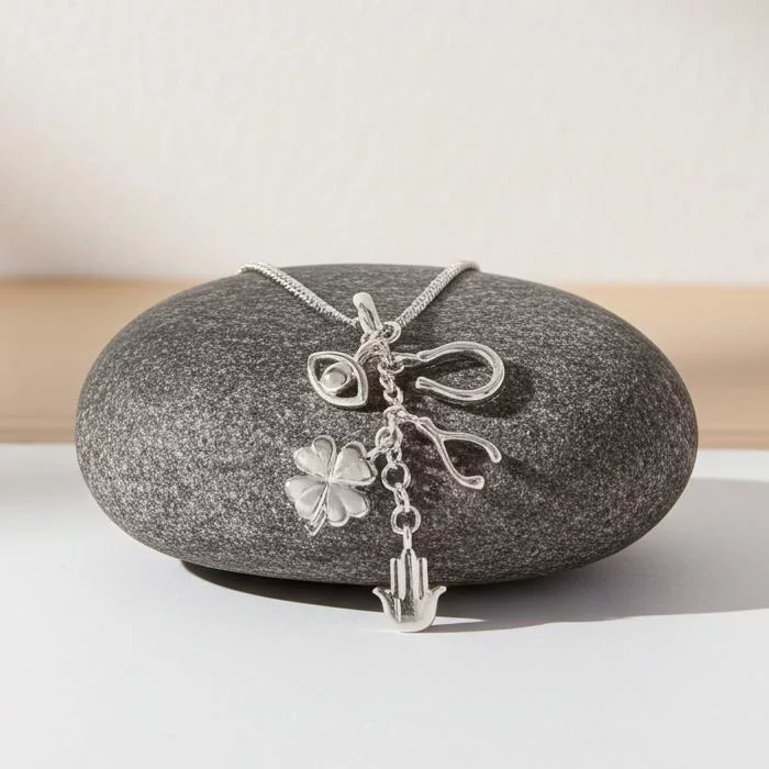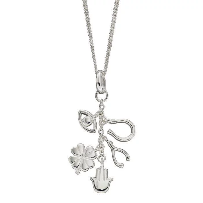 Comprises five lucky charms - Evil Eye, Horseshoe, 4-leaf Clover, Wishbone and Hamsa Hand.